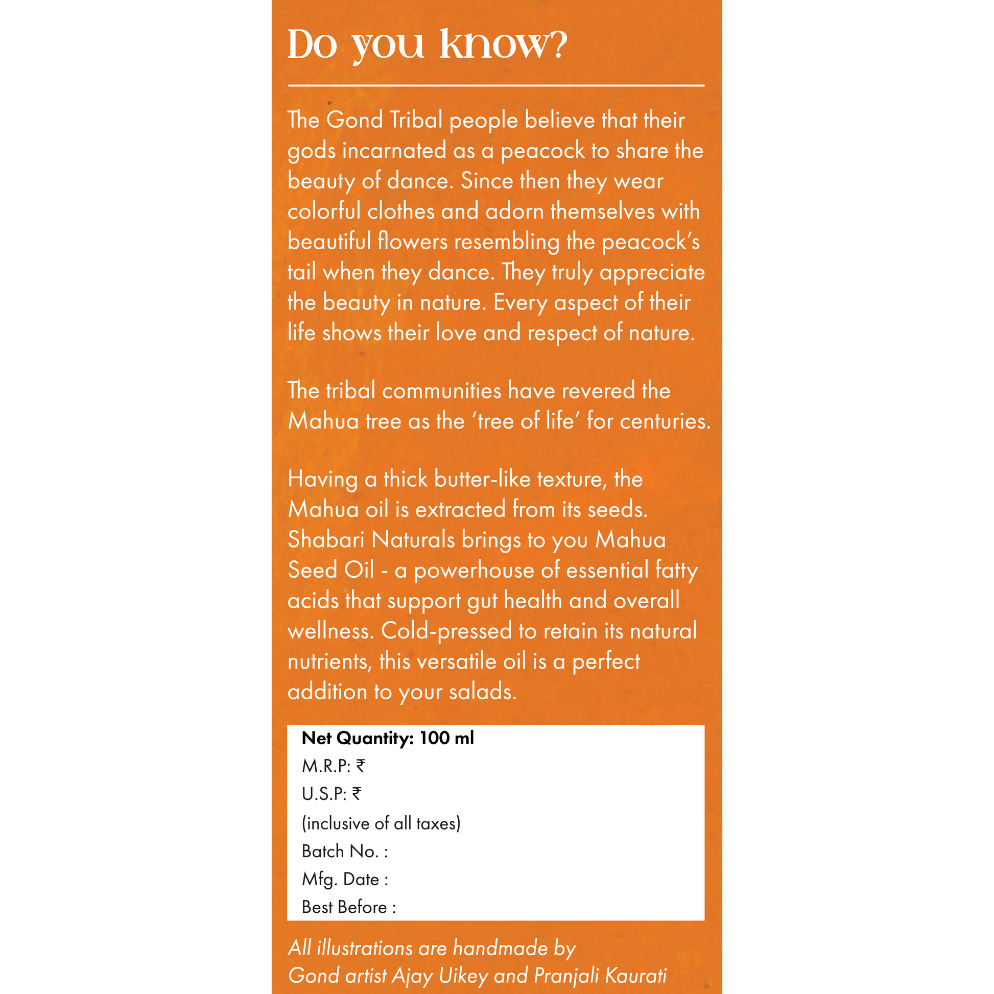 The tribal communities have revered the Mahua tree as the 'tree of life' for centuries. Having a thick butter-like texture, the Mahua oil is extracted from its seeds. Shabari Naturals brings to you Mahua Seed Oil - a powerhouse of essential fatty acids that support gut health and overall wellness. Cold-pressed to retain its natural nutrients, this versatile oil is a perfect addition to your salads.