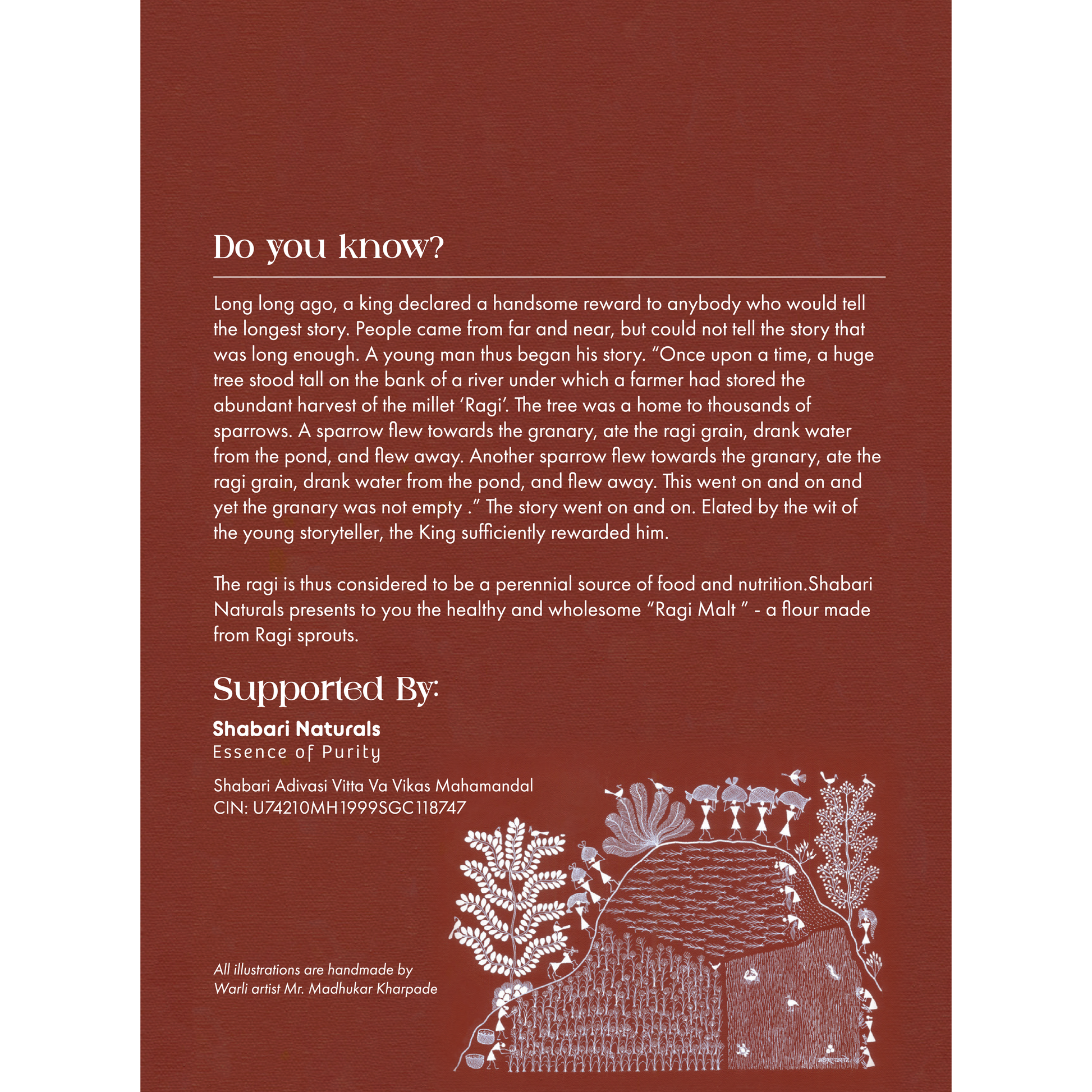 In Sanskrit, Ragi is also referred to as nritya-kundala, the dancing grains. The tribal folk tales are replete with stories of Gods who preferred Ragi over other grains because of its attractive color and taste. Since times immemorial the tribal communities from North Maharashtra have been cultivating Ragi. They sing beautiful songs during the farm operations and dance during the harvest festival. The Warli tribes depict life experiences in the form of beautiful paintings made from rice paste (another staple crop) that adorn the walls of their red-brown houses which is also the color of the ragi grains.