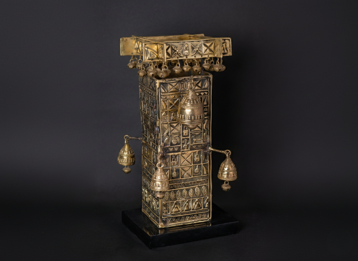 A rectangular pillar in traditional Dhokra style, echoing the carved wooden pillars once installed at the heart of tribal villages. Intricately patterned with geometric and symbolic motifs, it is adorned with four finely crafted bells that lend both rhythm and reverence. Cast in gleaming brass and mounted on a polished black base, this work of art transforms a cultural emblem into a timeless artifact—celebrating the continuity of indigenous craftsmanship while serving as a striking decorative piece.